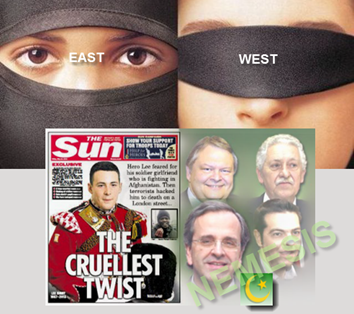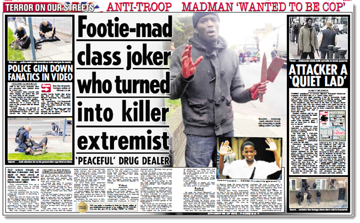 Ο δολοφόνος του Αγγλου στρατιώτη Michael Adebolajo σύμφωνα με όσα διάβασα στη Sun, ήταν ένα παιδί μεταναστών απο τη Νιγηρία που γεννήθηκε στην Αγγλία. Στο σχολείο ήταν ήσυχος και φιλικός πρός όλους. Μέχρι τα 16 του ήταν καθολικός. Από τα 16 του και μετά άρχισε να διαβάζει για το Ισλάμ και άρχισε να συμπεριφέρεται σαν γνήσιος Μουσουλμάνος. Στην πορεία άλλαξε το όνομα του σε Moujahid ή Holly Warrior (ιερός πολεμιστής), άρχισε να κρατάει μαχαίρι, να μιλάει για Τζιχάντ και να πουλάει ναρκωτικά σε γειτονιές του Romford. Το περίεργο ήταν ότι δεν πίεζε τους πελάτες του να πληρώνουν τα χρέη τους από την ηρωίνη και τη κοκαίνη που πούλαγε. Εδινε την ιδέα ότι του άρεσε να διαδίδει τα ναρκωτικά παρά να πληρώνεται για αυτά. Οταν λεφτά υπάρχουν για επενδύσεις…Ενδιαφέρον έχει η προβολή της διαφήμισης αριστερά απο τη SUN, όπου φαίνεται πώς οι Αγγλοι στηρίζουν τα θύματα ηρωικών πράξεων, δείχνοντας ότι ο πόλεμος στο Αφγανιστάν έχει μεταφερθεί στο εσωτερικό της Αγγλίας απο τους φανατικούς ισλαμιστές και ότι ο στραιτώτης ήταν στην πραγματικότητα θύμα ενός ιερού πολέμου.