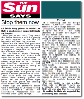 Η Sun επιτίθεται στη Βρετανική κυβέρνηση (στην Ελλάδα, ποιά εφημερίδα επιτίθεται στην Ελληνική;) λέγοντας ότι για τους Μπουσουλμάνους δεν υπάρχει έλεγχος σε όσα λένε. Αυτό θυμίζει τις προκλητικές ομιλίες που γίνονται στη Θράκη απο Τούρκους κατά της Ελλάδας και των χριστιανών, για τίς οποίες η κυβέρνηση και το δημοκρατικό τόξο δεν λαμβάνει κανένα μέτρο. Οπως διαβάζετε ανωτέρω, από χρόνια η Sun τα λέει (όπως και πολλοί στην Ελλάδα) αλλά δεν ακούγεται ενώ οι φίλοι του Βρετανικού μάλλον δημοκρατικού τόξου κοροιδεύουν όσους διαμαρτύρονται. Η Sun τα λέει όχι εγώ…