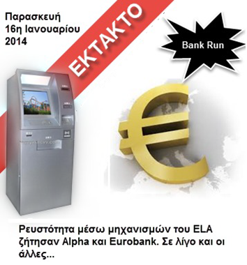 Με αφορμή το νεότερο απο τα άρθρα μου για μεγάλη πιθανότητα για Bail - In στην Ελλάδα (βλέπετε εδώ) τις απόψεις της Rotschild Βank που εκυκλοφόρησαν χτές σε κάποια ΜΜΕ, για το Bail - In και το Bank – Run, μέσα σε δύο μόνο απο τις πολλές οικονομικές επιλογές της Ελλάδας και την ρευστότητα μέσω μηχανισμών του ELA, που ζήτησαν σήμερα Παρασκευή οι τράπεζες Alpha και Εurobank, που δείχνουν προς ένα επερχόμενο Bail-In και ένα έντονο Bank-Run απο Δευτέρα, αν ο Ντράγκι επιμείνει στην επιλογή του να μη δϊνει ρευστότητα στις Ελληνικές τράπεζες, παρά μόνο μέσω προγράμματος, μνημονίων και δανεισμού, θα σας παρουσιάσω τις απόψεις μου για το πώς μπορεί να εξελιχθεί η κατάσταση. Σημειώστε, ότι το μηχανισμό έκτακτης ρευστότητας ELA τον ελέγχει η ΕΚΤ, δηλαδή ο Ντράγκι.